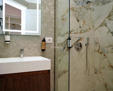 The private bathroom is equipped with a contemporary shower, along with complimentary toiletries, slippers, towels, and a hairdryer for your convenience.